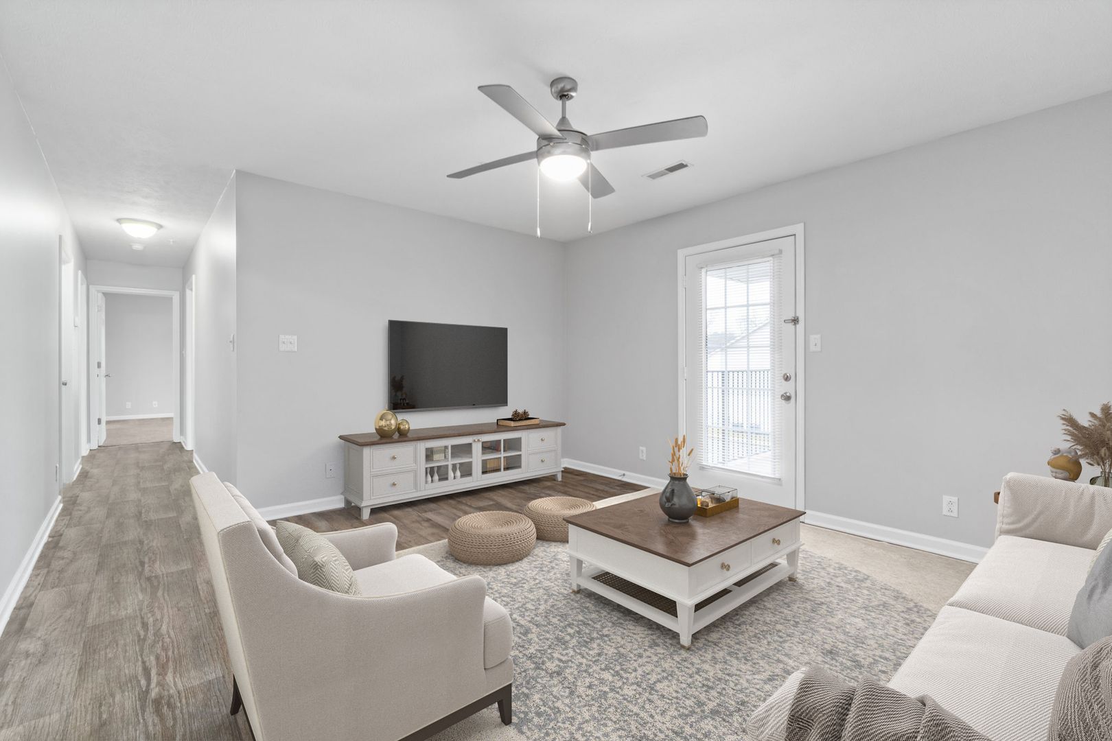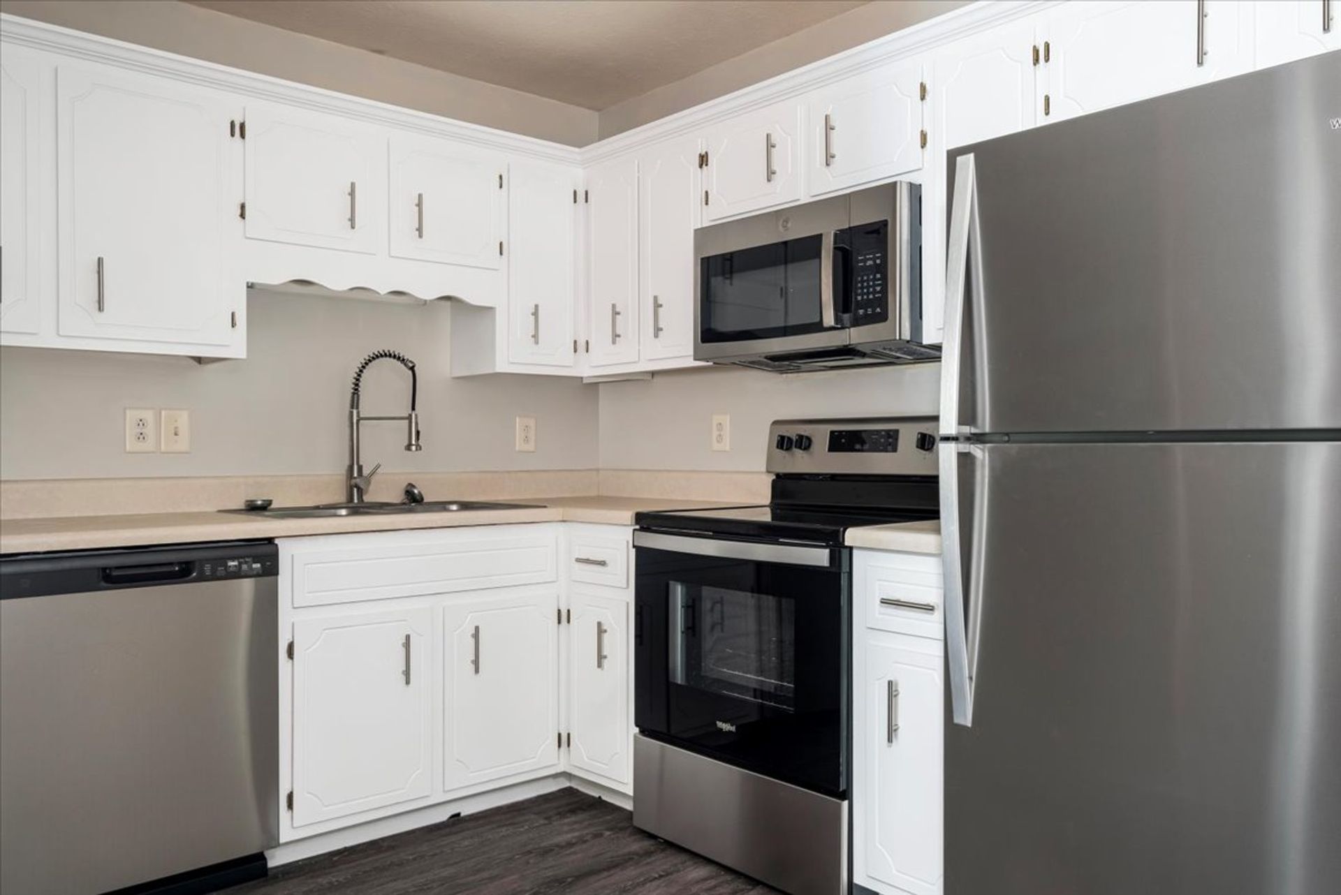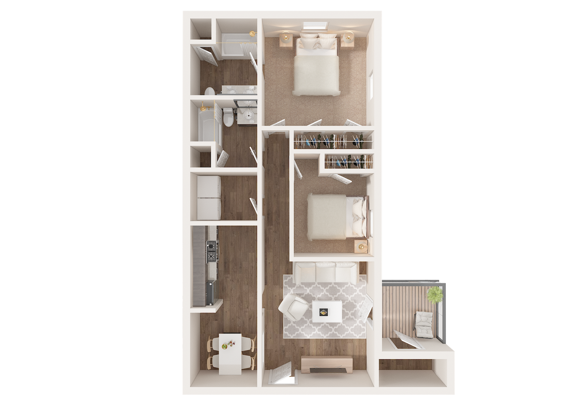 Our apartments include a washer and dryer in each unit, new flooring, all electric appliances, and a private patio. The 2 bedroom 1.5 bathroom floor plan is spacious and comfortable. We know you'll love it here!
